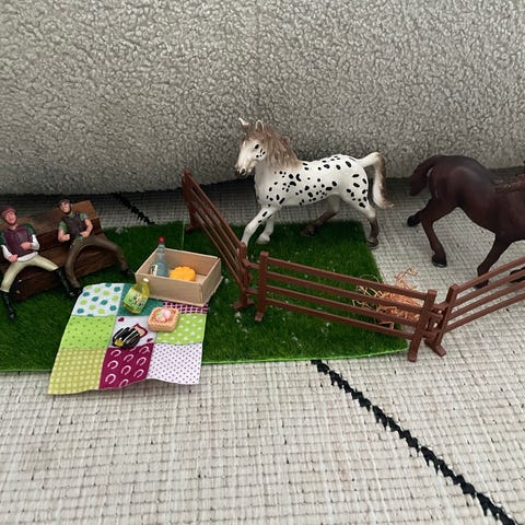 Schleich joulukoriste leikkisetti. Settiin kuuluu pieni punainen ovi valkoisella karmilla, kaksi joulukuusta, lyhtypylväs, lahjapaketteja, punaiset kengät, Merry Xmas -kyltti, juuttisäkki sekä oljesta tehty koristevuohi punaisella nauhalla. Sopii lasten leikkeihin ja jouluisen miniatyyrimaiseman rakentamiseen.