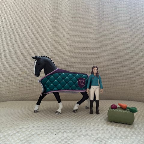 Schleich hevosleikkisetti, johon kuuluu kaksi hevoshahmoa, kaksi ihmishahmoa, aitauselementtejä sekä piknik-aiheisia tarvikkeita. Setissä on muun muassa ruohoa esittävä alusta, viltti, laatikko ja pieniä ruokatarvikkeita. Sopii hevosleikkeihin ja mielikuvitusleikkeihin Schleich-figuurien kanssa.