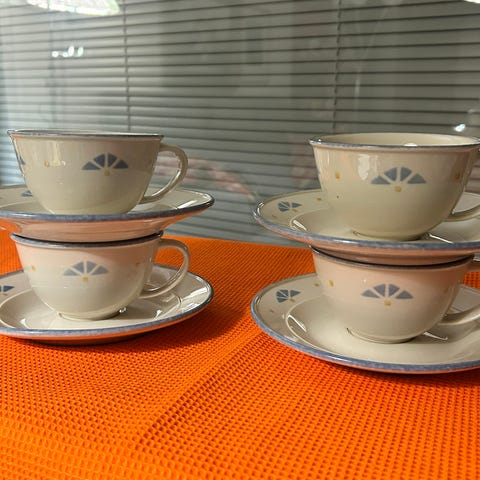 Viisi Pentik Tapio kahvikuppilautasia, kolme ehjää kuppia ja yksi vähän kärsinyt kuppi joka tulee kaupan päälle. Koko setti 20 €. (Toisella ilmoituksella myynnissä sokerikko ja kermakko)