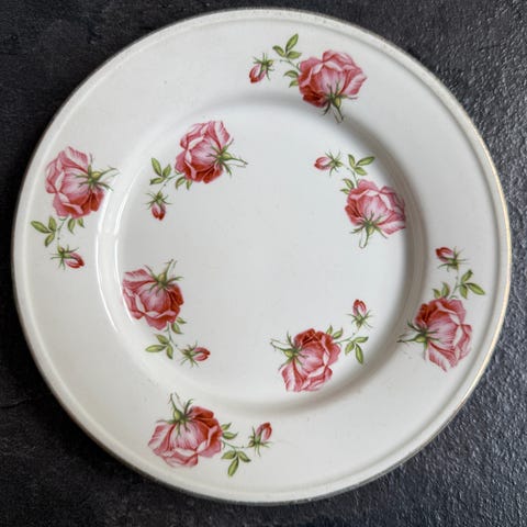 6 kahvikuppia, 6 aluslautasta A. R. nimikirjaimin, 6 leivoslautasta. Käsinmaalatut Saara Saarilahden astiat 1985. Astiat puolalaiset. Yksi pieni lautanen liimattu.