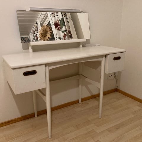 Vähän heiluva ja vuosien saatossa tullut kulumia. Olen päälystänyt pöydän.