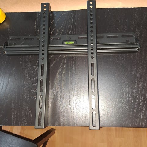 Ollut käytössä reilut kolme vuotta. Mukana saa ruuvit, joilla on ollut seinässä kiinni. Lisäksi tarvitset sopivat proput ja ruuvit/kiinnikkeet, joilla televisio kiinnitetään mustiin kiskoihin.