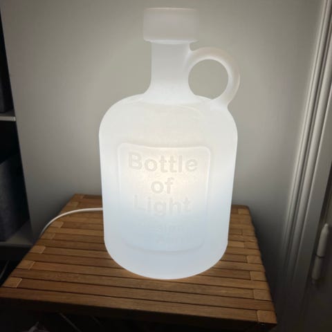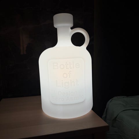 Professori Eero Aarnio sai valaisimeen idean vanhasta sadusta, jossa hölmöläiset rakensivat talon ilman ikkunoita ja yrittivät sitten kantaa valoa sisälle säkeissä. Säkit eivät toimineet, mutta tämä pullo tuo valon minne vain haluat! Tartu kahvasta ja vie valoa sinne, missä sitä tarvitaan. Leikkisä muoto ja pullon kahva mahdollistavat monenlaisen asettelun - valaisimen voi myös ripustaa roikkumaan kahvasta. Bottle of Light on Studio Eero Aarnio -sarjan upea sisustusvalaisin, jonka lempeä valo syntyy valmistustavasta – valuprosessin aikana muoviin syntyy mikroskooppisen pieniä ilmakuplia, joiden ansiosta valo leviää tasaisesti. Valaisin on valmistettu Suomessa. Materiaali on myrkytöntä ja turvallista, 100% kierrätettävää polyeteenimuovia.