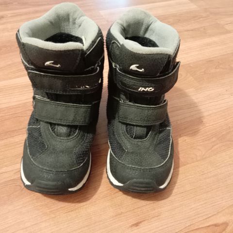 Viking lasten kengät, koko 30. Väri musta, valkoinen pohja. Kengissä tarrakiinnitys kahdella remmillä ja nilkkapituiset varret. Siistissä kunnossa.