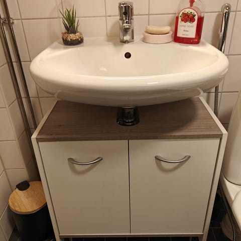 kaappia, joissa on sekä hyllyjä että vaatekaappiin sopiva tanko. Allaskaappi myydään ilman allasta ja hanaa. Kaappien ovet ovat kehykselliset ja väriltään vaaleat. Sopii esimerkiksi kodinhoitohuoneeseen, keittiöön tai varastotilaan säilytysratkaisuksi. Ovien alareunoissa on näkyvissä käytön jälkiä.