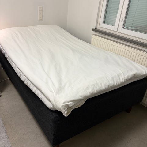 Musta runkopatjasänky metallijaloilla. Petauspatja kuuluu hintaan. Muuton tieltä pois.