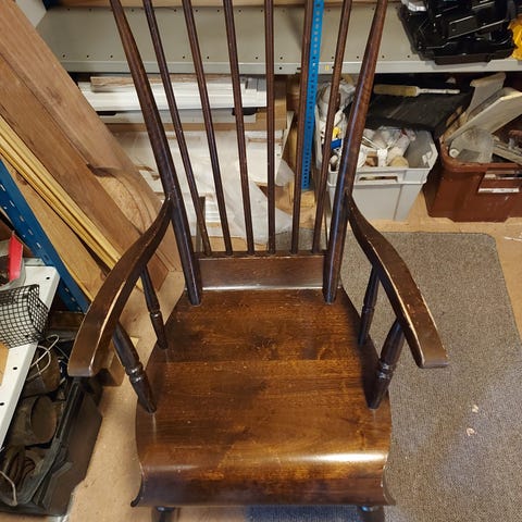 Brown rocking chair. Leg length 108 cm, height 100 cm, max width 32 cm.