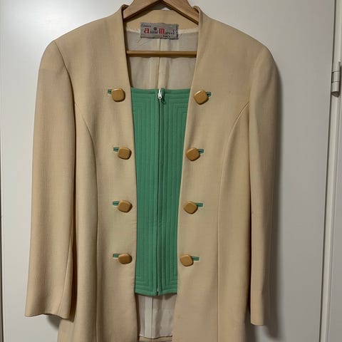 Villakankainen, vaalea, tyylikäs jakkupuku. Ei tahroja tai käytönjälkiä, kokolapun mukaan 44/L, vastaa enemmän kokoa 36/38, varsinkin hameen osalta, takissa olkatoppaukset. Chanel henkinen klassikko.