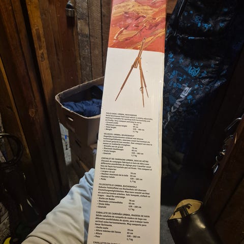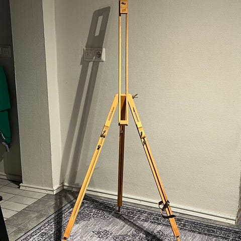 Puinen maalausteline kolmijalka. Teline soveltuu esimerkiksi maalaus- ja piirustustöihin. Korkeutta voi säätää, ja jalat taittuvat kasaan säilytystä ja kuljettamista varten. Materiaalina on puu, ja teline on kevyt siirtää huoneesta toiseen tai ottaa mukaan työskentelypaikalle. Aikuisen korkeus.