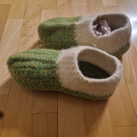 Itse huovutetut tossut koko 41-43 tumman vihreä väri. Lankana laadukas Alafosslopi 100% Islannin villalanka. Todella lämpimät ja mukavan kevyet jalassa. Uudet.