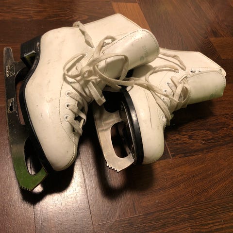Susana taitoluistimet, koko 37. Valkoiset nauhalliset luistimet, joissa terät kiinnitetty ruuveilla pohjaan. Soveltuvat yleiseen luisteluun sisä- ja ulkojäällä. Materiaalina keinonahkaa ja metalliterät. Kengän varsi antaa nilkalle tukea luistelun aikana.