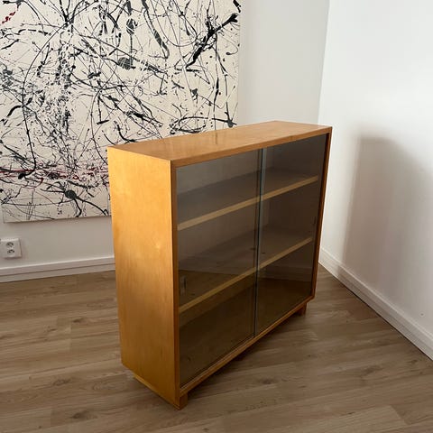 Myydään Askon uusiotuotantoa 1990-luvulta: 2 Aukusti-sarjan seinävitriiniä ehjillä liukulasiovilla. Väri kirsikka. Mukana ruuvit.