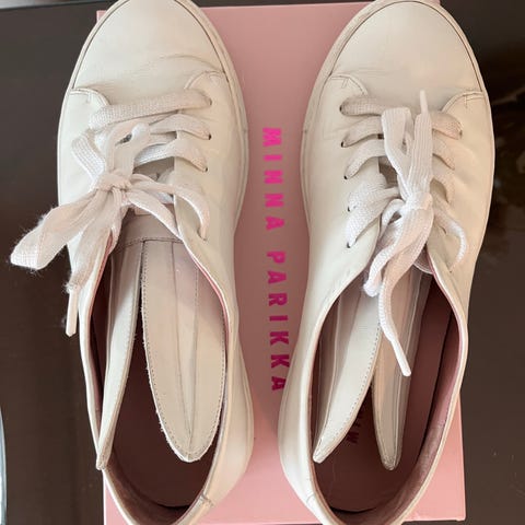 Minna Parikka tennarit, koko 39. Valkoiset nauhakengät, joissa tunnusomaiset pupunkorvat ja vaaleanpunaiset tupsut kantapäässä. Matala kumipohja ja pyöreä kärki.