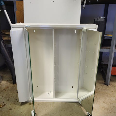 Ikean peilikaappi. Sisällä kaksi lasihyllyä, ocien sisäpuolelle kiinnitetty teipeilä peilit. Jotain jälkiä valkoisessa pinnassa.