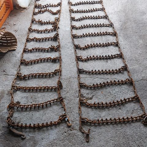 Piikittömät lumiketjut. Sikäli eriparia, että yhdessä ei lisäosaa jolloin leveys 55cm. Ja toisessa 5cm lisäosa puolellaan on, jolloin leveys 65cm. Keskiosat näyttäisi kuitenkin samalta keskenään. Pituus noin 350cm. Ei tietoa millä renkaalla ollut. Jos arvata pitäis, niin tuskin 13.6 tuumaa leveämmällä renkaalla.