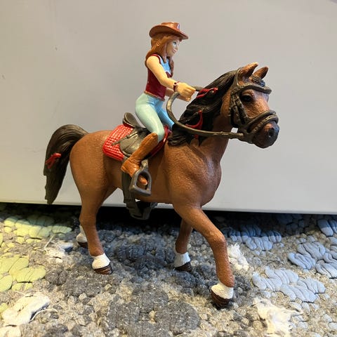 Schleich hevonen ja ratsastajahahmo lelufiguuri. Settiin kuuluu tumma hevonen varusteineen sekä ratsastajahahmo kypärällä.