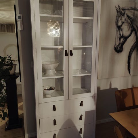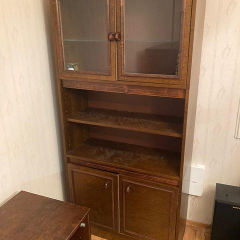 Myydään kuvan mukainen lasiovinen kaapistosarja. Mieluiten myyn sarjana, mutta voi tiedustella myös yksittäisten kalusteiden ostamista. Yhdessä isomman kaapin jaloista on pinnassa lohkeama, joka ei kuitenkaan ole näkyvillä. Muuten kaapisto on oikein hyvässä kunnossa.