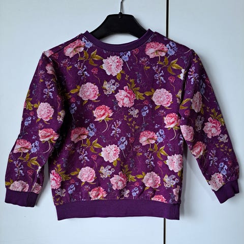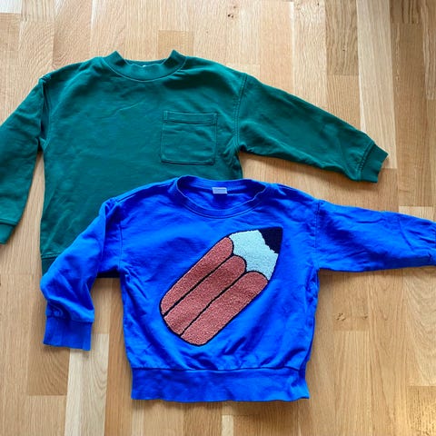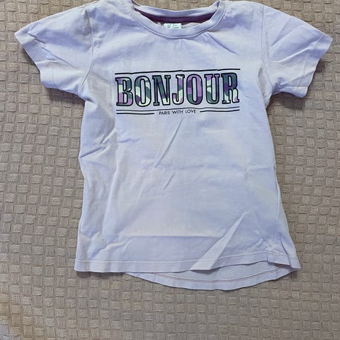 H&M Belle-paita 98/104, kunto kohtalainen, tekstiprintissä ollut nukka kulunut lähes kokonaan pois ja kuvaprintti halkeillut.