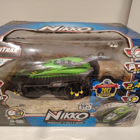 Nikko Velocitrax radio-ohjattava telaketjuauto. Sisä- tai ulkokäyttöön. Speksit linkin takana https://www.jollyroom.fi/lelut/kauko-ohjattavat-lelut/autot/nikko-kauko-ohjattava-auto-velocitrax-28-cm-vihrea