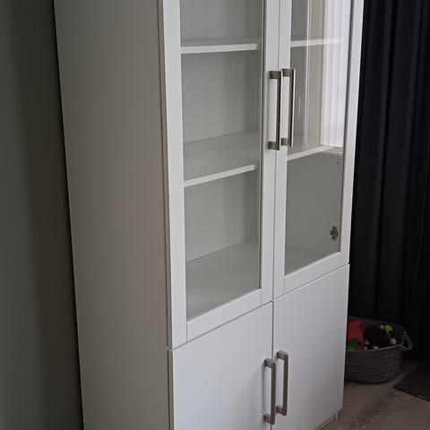Siistikuntoine vitriinikaappi, ovellisia, lasiovia ja hyllykköjä.