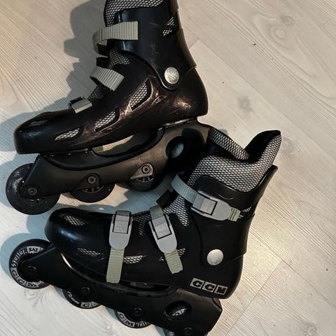 Rullaluistimet, koko 39. Väri musta‑harmaa vaaleanpunaisilla yksityiskohdilla. Neljän renkaan malli, jossa tukeva varsi ja säädettävät remmit. Muutaman kerran testattu. Stadiumista ostettu reilu vuosi sitten.