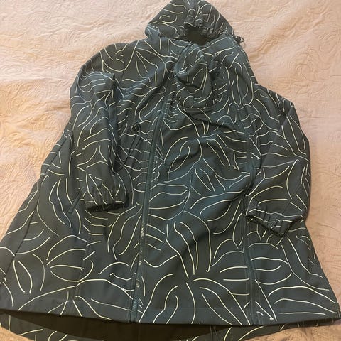 Takissa kaksi eri paneelia, jotka saa vetoketjulla kiinni. Toinen raskausajalle, toinen vauvan kantamiseen kantorepussa/liinassa. On ollut paljon käytössä, silti aivan ehjä. Toimii myös myöhemmin tavallisena takkina.