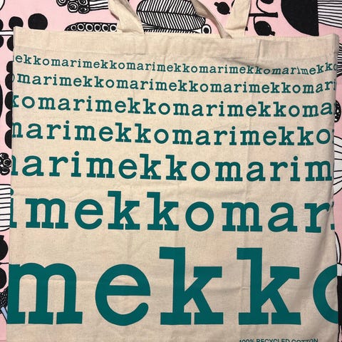 Myydään käyttämätön Marimekko kangaskassi. Materiaali kierrätettyä puuvillaa. Pohjaväri luonnonvalkoinen, kirjaimet mustalla fontilla ja ruusut violetteja.