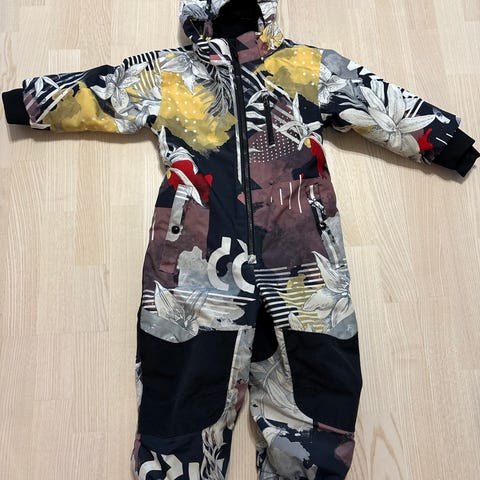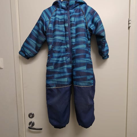 Minymo-merkkinen talvihaalari, koko 98. Pepussa tummentumaa ja yksi vetoketjun päälle tulevan läpän tarranauhoista vähän irti, mutta ei haittaa käyttöä. Ei siis enää ihan priima, mutta oikein kelpo haalari pihatouhuihin :)