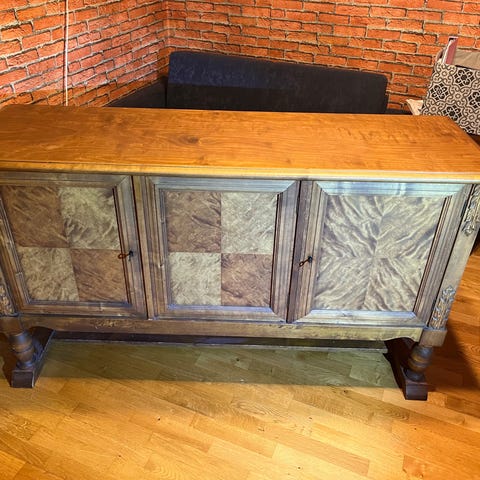 Materiaalina lakattu tai petsattu puu, jossa näkyvä puunsyykuviointi. Hyväkuntoinen.