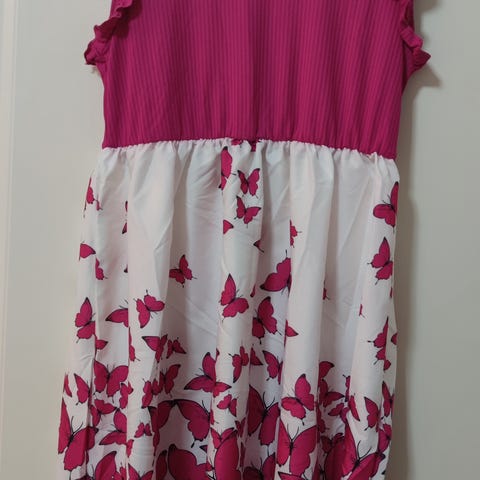 Erinomaisessa kunnossa oleva tyttöjen raidallinen mekko koossa 150 cm. Materiaali joustava, 95% puuvilla ja 5% elastaani.