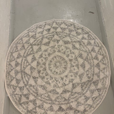 IKEA pyöreä matto beigellä, geometrisella kuviolla. Matto sopii esimerkiksi olohuoneeseen, makuuhuoneeseen tai eteiseen. Materiaali vaikuttaa tasapintaiselta ja tiiviiltä, mikä helpottaa puhtaanapitoa. Väri ja kuviointi ovat hillittyjä, joten matto on helppo yhdistää monenlaiseen sisustukseen.