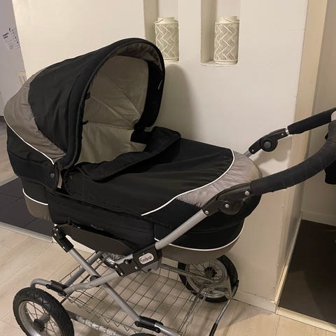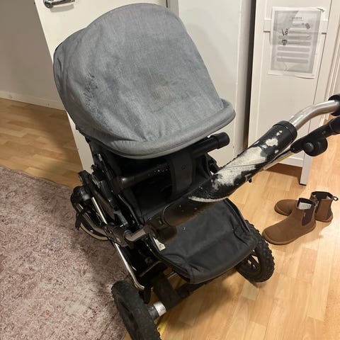 Emmaljunga lastenrattaat tummansinisellä ja harmaalla värillä. Rattaissa on säädettävä selkänoja, viisipistevaljaat ja turvakaari. Runko on metallinen ja työntöaisa on yhtenäinen. Soveltuu yhdelle lapselle istuttavaksi. Rattaissa on tahroja mutta lähtee pesemällä pois.