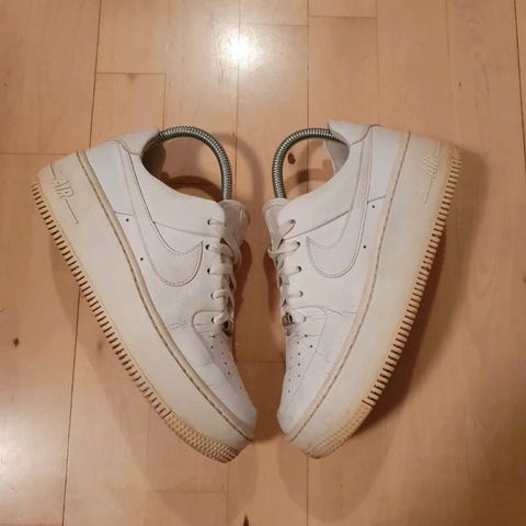 Nike Air Force 1 tennarit koossa 41, valkovihreät. Paljon käytetty joten kulumaa löytyy! Pohjalliset kannattaa vaihtaa, ne aika kuluneet. Kengät kuitenkin päälisinpuolin ehjät.
