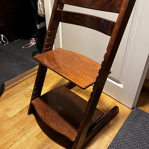 Stokke Tripp Trapp syöttötuoli. Klassinen, säädettävä puinen syöttötuoli, väri valkoinen. Istuimen ja jalkalaudan korkeutta ja syvyyttä voi säätää lapsen kasvun mukaan. Sopii käytettäväksi ruokapöydän ääressä, ja tuoli on suunniteltu tarjoamaan ergonomisen istuma-asennon eri-ikäisille lapsille. Materiaali maalattua puuta, metalliset tukitangot. Soveltuu käytettäväksi valmistajan ohjeiden ja painorajoitusten mukaisesti.