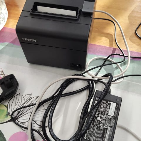 Siistikuntoinen, vähän käytetty Epson TM-T20II (malli M267D) -kuittitulostin (POS-lämpötulostin), jossa USB-liitäntä ja sarjaportti. Mukana tulee USB-kaapeli ja virtalähde.