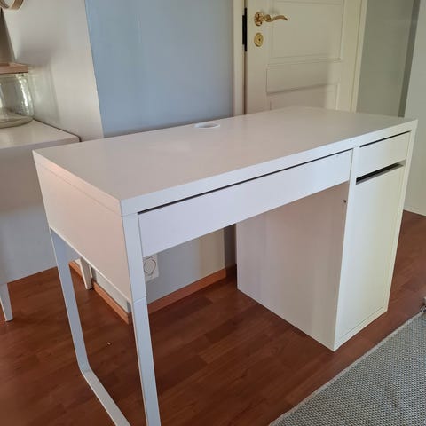 Useamman vuoden vanha ikean työpöytä. Sisäpuolella yksi ruuvinreikä vahingoittunut. Yksi ruuvi puuttuu. Eivät varsinaisesti haittaa käyttöä.