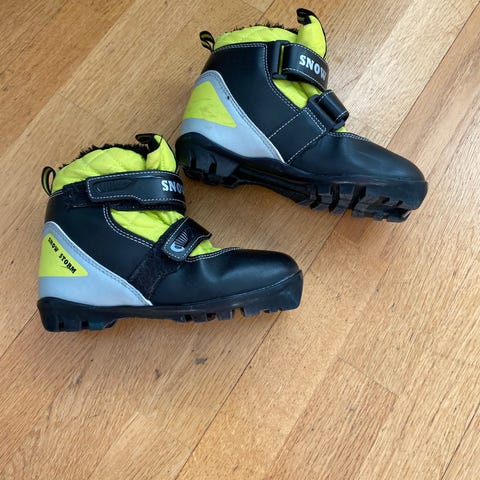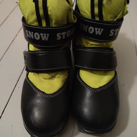 Snow Storm lasten hiihtomonot, koko 34. Väritys musta ja kirkkaan keltainen harmailla yksityiskohdilla. Päällinen synteettistä materiaalia, sisävuori tekstiiliä. Kiinnitys kahdella tarranauhalla, jotka helpottavat pukemista ja riisumista. Soveltuu lasten maastohiihtoon.