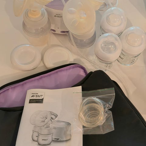 1 uusi aventin pullo jonka kierteet sopii pumpuun ja näin on kätevää pumpata suoraan pulloon.