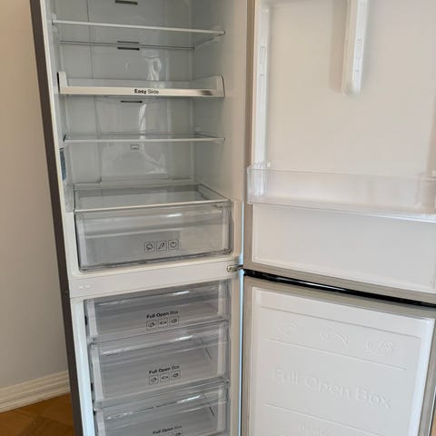 Samsung jääkaappipakastin, jossa yläosassa jääkaappi ja alaosassa pakastin. Valkoinen ulkoväri. Jääkaappiosassa useita säädettäviä hyllyjä, ovihyllyt ja vihanneslaatikko. Pakastinosassa vetolaatikot pakasteiden säilytykseen. Soveltuu elintarvikkeiden viilennykseen ja pakastamiseen kotitalouskäytössä.