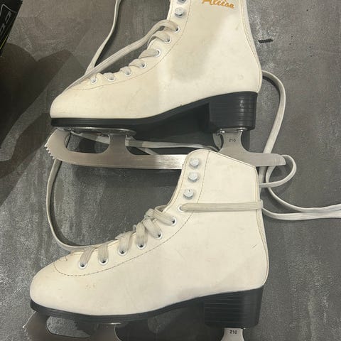 Aliisa luistimet, lasten koko 37. Valkoiset nauhalliset varrelliset luistimet, joissa terän pituus noin 230 mm. Soveltuvat yleiseen luisteluun. Materiaalimerkinnän mukaan päällinen ja vuori synteettistä materiaalia, pohja kumia ja terät metallia.