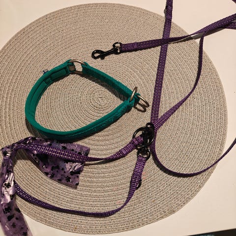 Harry Potter-teemaiset kaulapanta ja hihna, molemmissa Hogwarts -teksti ja kuminen Gryffindor -tuvan logolaatta.