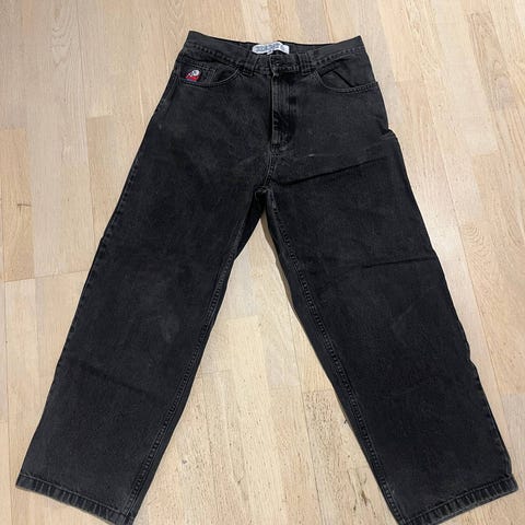 Myydään vaaleansiniset Polar Big Boy -farkut omasta kokoelmasta. Housut ovat yleisilmeeltään hyvässä kunnossa. Ainoa huomautettava asia on lahkeiden suissa oleva kuluma, mikä on näille housuille tyypillistä ja normaalia ajan myötä tullutta kulumaa (katso kuvat).