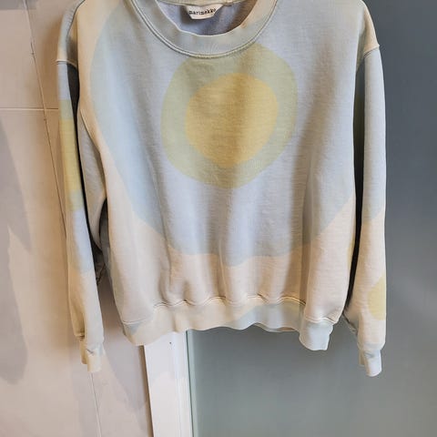 Adidas x Marimekko collegepaita, koko S. Punainen paita, jossa oranssi kuviollinen printti kauttaaltaan. Kunto oikein hyvä. Pituus olalta helmaan n. 57cm.
