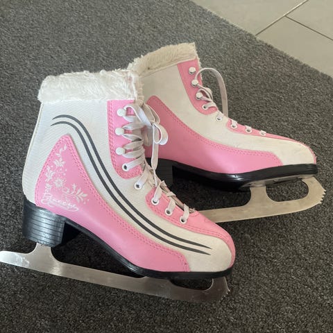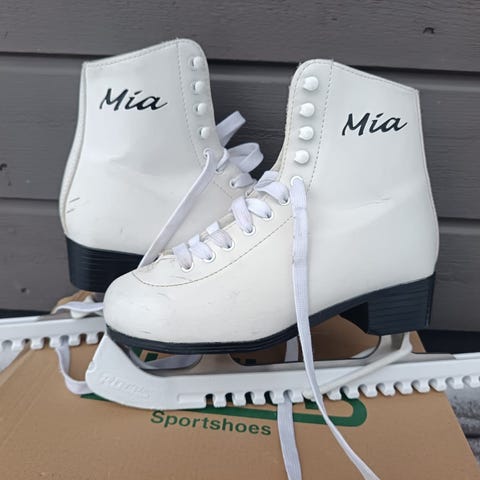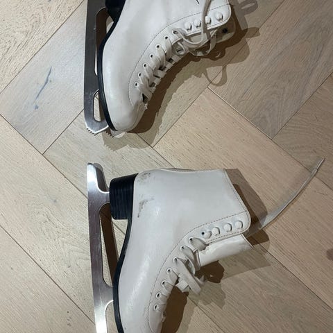 Myydään Mia taitoluistimet. Käytetyt, mutta siistit ja täysin toimivat. Koko EU 37, pohjallisen pituus noin 24 cm. Luistimissa perinteinen taitoluistelumalli ja valkoiset kengät. Terässä merkintä 9 1/3. Nahkaosissa näkyy kevyttä käytön jälkeä ja pieniä naarmuja, ei repeämiä tai rakenteellisia vaurioita. Nauhat ja kiinnitys kunnossa. Terät käytetyt, kunto vastaa harrastekäyttöä. Mukana teräsuojat. Ulkonäkö ja kunto on esitetty mahdollisimman tarkasti kuvissa, kuvat ovat osa kuvausta. Myydään sellaisena kuin ovat.