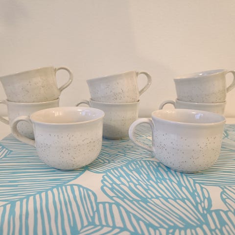 Kulta Keramiikka vaaleanvihreitä kuppeja 5 kpl aluslautasilla ja lisäksi kermanekka ja sokerikko. 13 osaa: kuppeja ja aluslautasia 5+5, Sokerikko kannella 1+1 ja kermakko 1kpl.