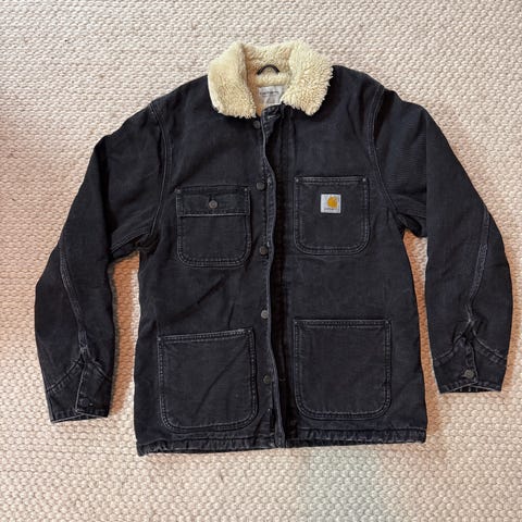 Carhartt active takki vuodelta 1994 koossa L mutta fittaa myös hyvin M. Väri alunperin beige mutta haalistunut valkoiseksi, ruskeilla resoreilla. Materiaali puuvillaa. Takissa on vetoketjukiinnitys, edessä kaksi isoa taskua ja huppu kiristysnyörillä. Vuorillinen malli, sopii arki- ja ulkokäyttöön viileämpiin säihin.