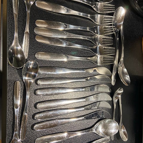 Jälkiruoka / alkuruoka aterimet tai miksei lapsille sopivat aterimet. 6 veistä ja 6 haarukkaa noin 16,5cm. Hinta 25€.