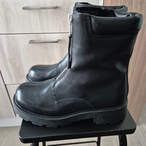 Naisten Vagabond talvikengät, koko 40, nahkaa. Nauhalliset, pohkeen mittaiset kengät, joissa sivussa vetoketju pukemisen helpottamiseksi. Väri punainen, mustat pohjat. Uudet, pitkät mustat kengännauhat. Lämmin karvavuori. Kengät ovat käytetyt, mutta hyväkuntoiset, vetoketjut toimivat hyvin. Punainen väri kuluu herkemmin. Mukaan Famacon värillinen kenkävoide, jolla voi kirkastaa kengän väriä. Kenkäväri tarkoitettu punaiselle kengälle.