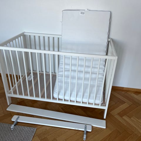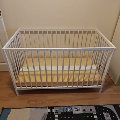 Gulliver pinnasänky, jossa irroitettava laita ja säädettävä pohjan korkeus. Sopii vauvalle ja taaperolle. Mukaan erittäin siistikuntoinen pussijousitettu Jättetrött-patja (89€), joka on ollut käytössä alle vuoden ja jonka kanssa on käytetty patjasuojusta (suojus myös halutessa mukaan). Ei näy kuvissa, mutta mukaan saa myös Len-reunapehmusteen.