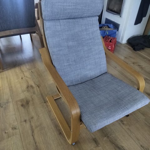 Pientä kulumaa istuinkankaassa, näkyy valossa. Muuten ryhdikäs ja napakka istua. Pestävät päälliset.
